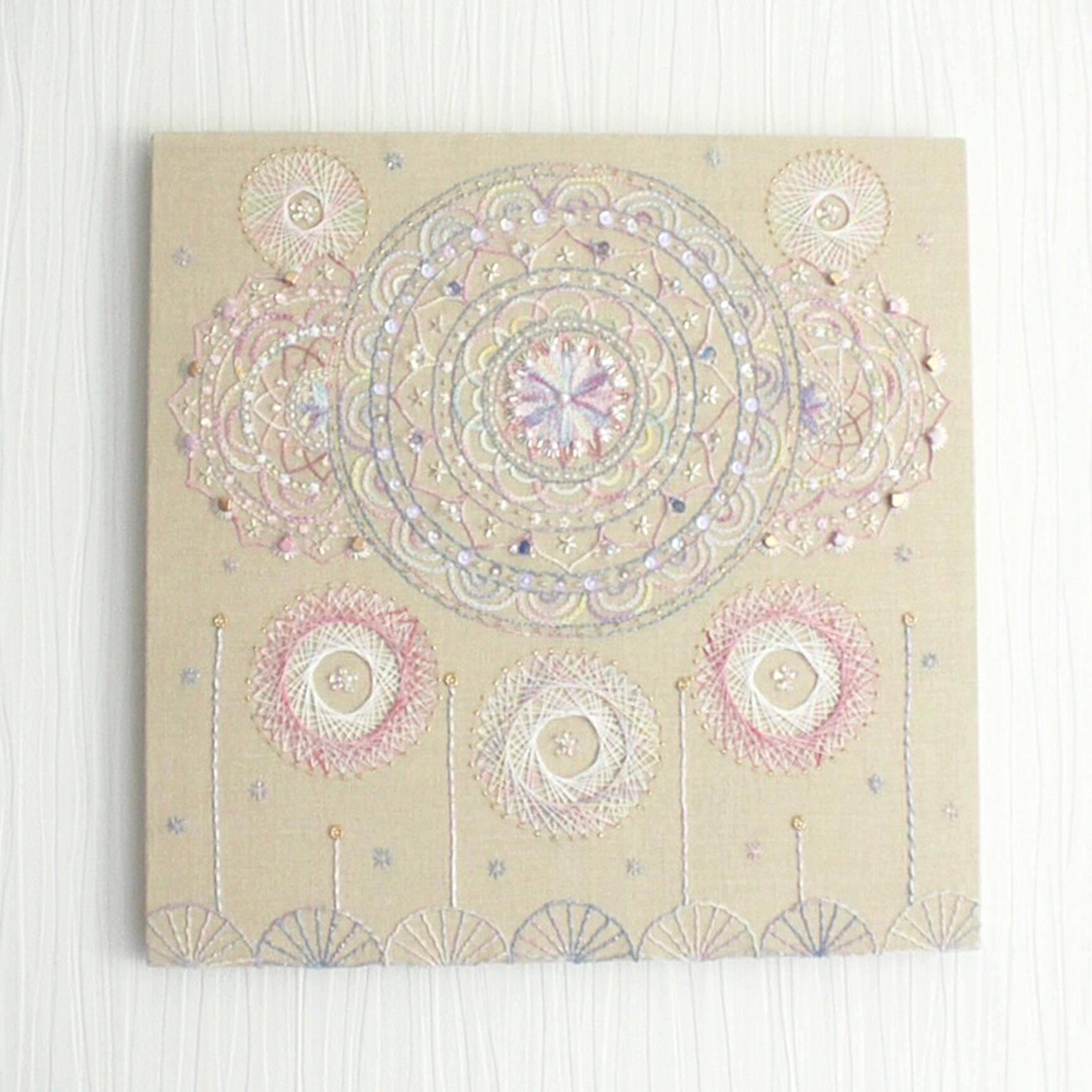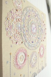 This is a mandala art panel created with stitching and embroidery.